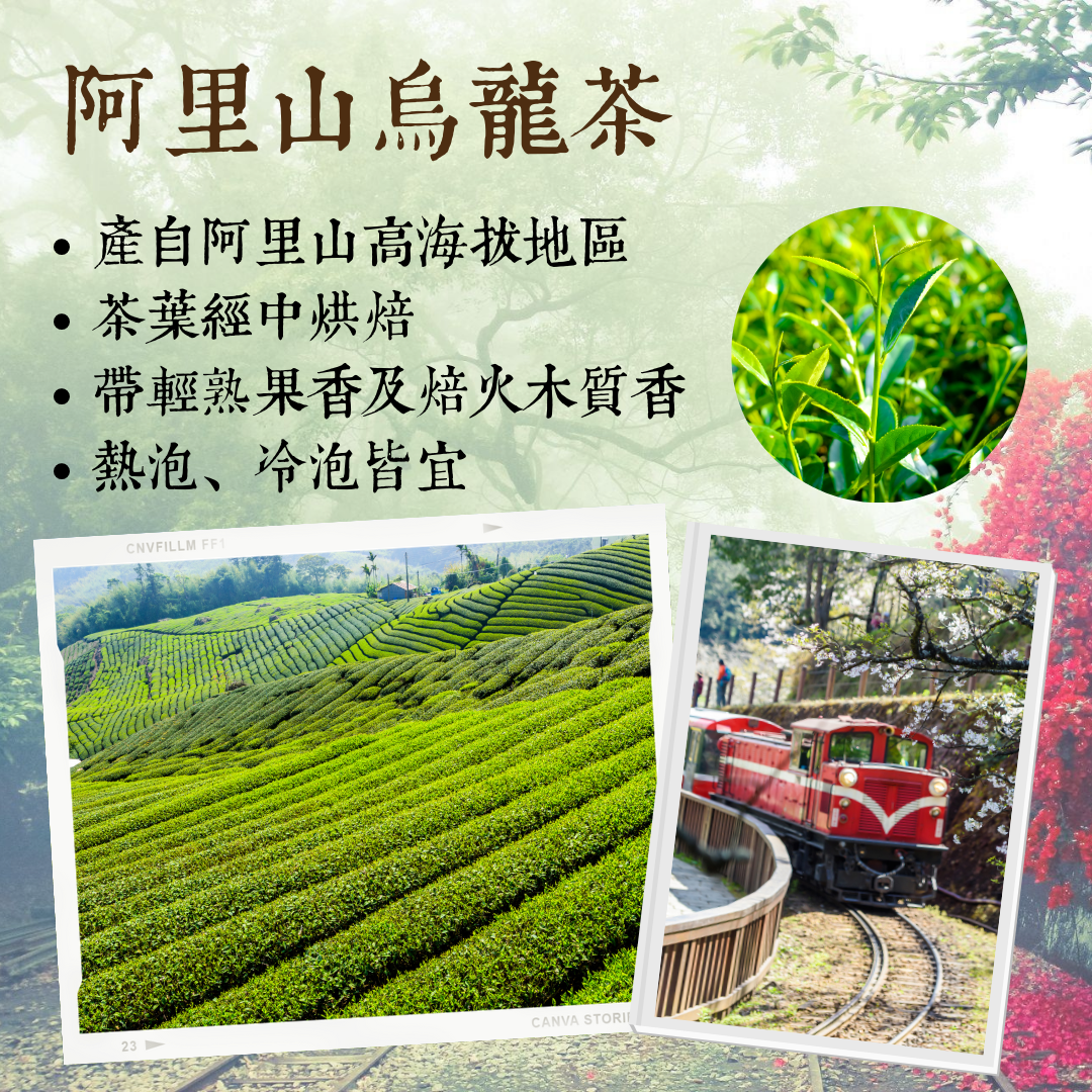 阿里山烏龍茶採自傳統名茶區南投縣東部,在海拔1200公尺左右。茶區早晚雲霧籠罩,高山氣候冷涼,平均日照短,雨水多,茶樹芽葉所含兒茶素類等苦澀成分因而降低,十分適合高山茶的生長,令芽葉更柔軟,色澤更翠綠,葉肉更厚,因此,阿里山高山烏龍茶可說是台灣高山茶頂級的茶品。